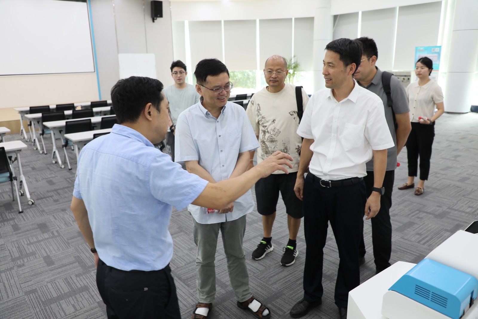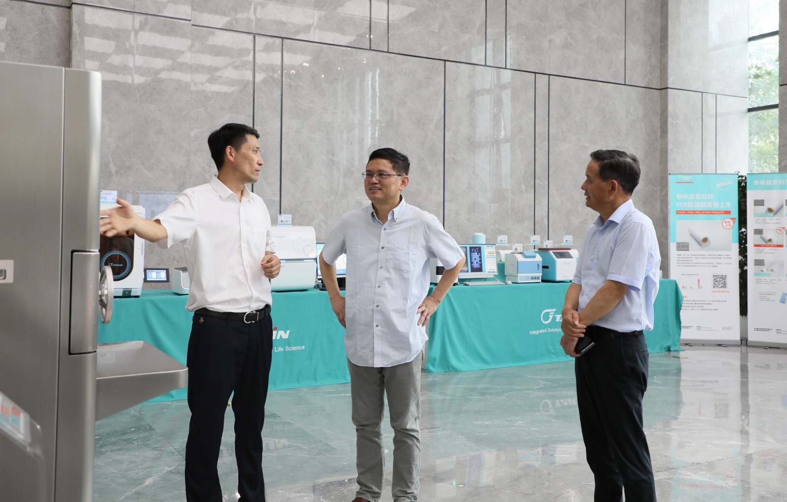 隨后,調(diào)研團一行來到泰林生命科學(xué)園區(qū),相繼參觀了展廳產(chǎn)品區(qū)、膜技術(shù)生產(chǎn)車間、培養(yǎng)器車間、凍干車間和實驗室。沈總向?qū)<覀兘榻B了公司的技術(shù)成果、業(yè)務(wù)布局、發(fā)展規(guī)劃、創(chuàng)新應(yīng)用案例等情況,調(diào)研團深入感受了“硬科技”加持的制造新力量。