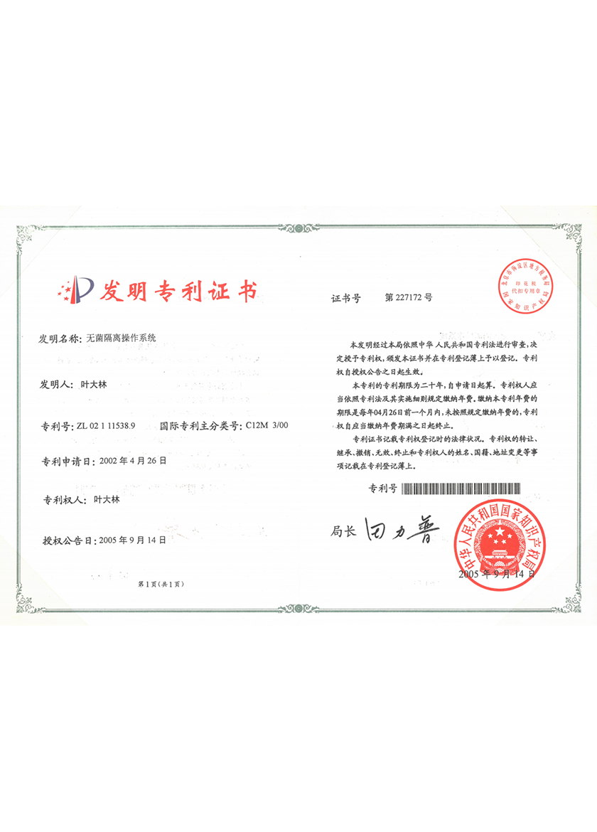 無(wú)菌隔離操作系統(tǒng)ZL02111538. 9 -
